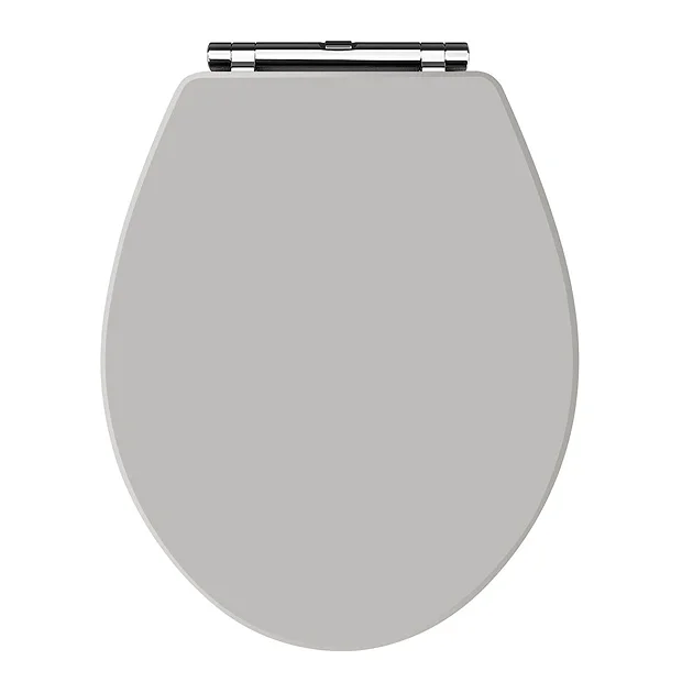A high-quality traditional round stone grey finish wooden toilet seat with chrome hinges, ideal for creating a period look in your bathroom. Designed for use with Carlton toilets. This grey soft close toilet seat comes with non-slip buffers.