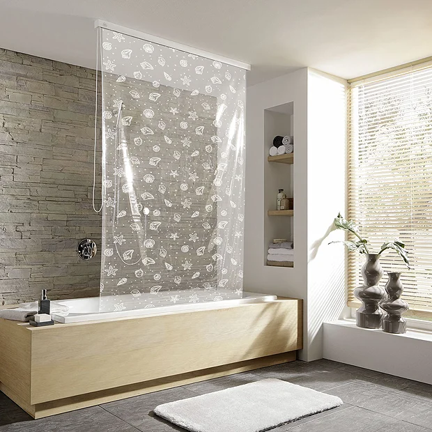 A stylish roller blind with snow white design from Kleine Wolke, this vinyl Waterproof blind is pulled up and down by a pull string, providing an innovative space saving solution for preventing water splashing from the shower area.
