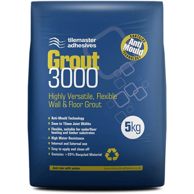 Grout 3000 is a highly versatile wall and floor grout specially formulated using carefully selected cements and additives to provide a smooth, creamy, controlled workability. Grout 3000 is flexible and is suitable for use on surfaces subject to limited movement and/or vibration such as plywood overlay, plasterboard and under floor heating. Grout 3000 is suitable for grouting a large variety of wall and floor tiles with joint widths between 2mm and 15mm wide. Â Grout 3000 has very low permeability making it ideal for use in areas subject to prolonged or permanent wet conditions such as wet rooms and swimming pools. Grout 3000 is suitable for use internally and externally and is unaffected by frost after setting.