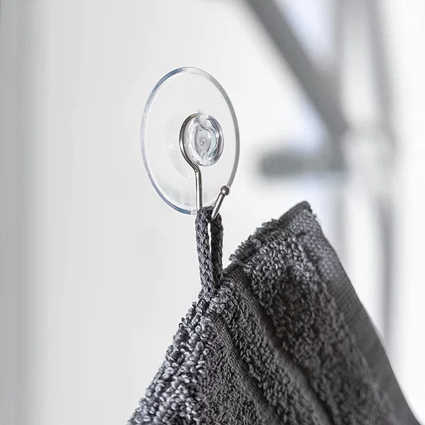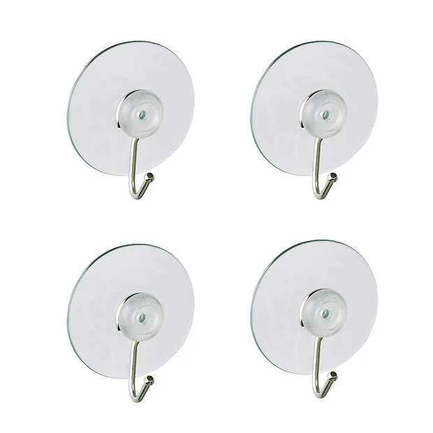 A pack of 4 practical high quality suction hooks. Features transparent suction cups with satin nickel finish stainless steel hooks.