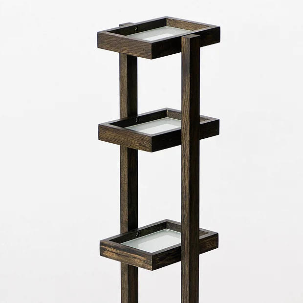 Keep all your toiletries and bathroom essentials organised with this freestanding shelving washstand. It features four frosted, tempered glass shelves that combine elegantly with a solid oak frame to provide the perfect solution for your storage needs. Beautifully crafted from white oak and oak veneers and finished with a dark stain water resistant lacquer. The silicone feet stop it from slipping and prevents your floor from being scratched.